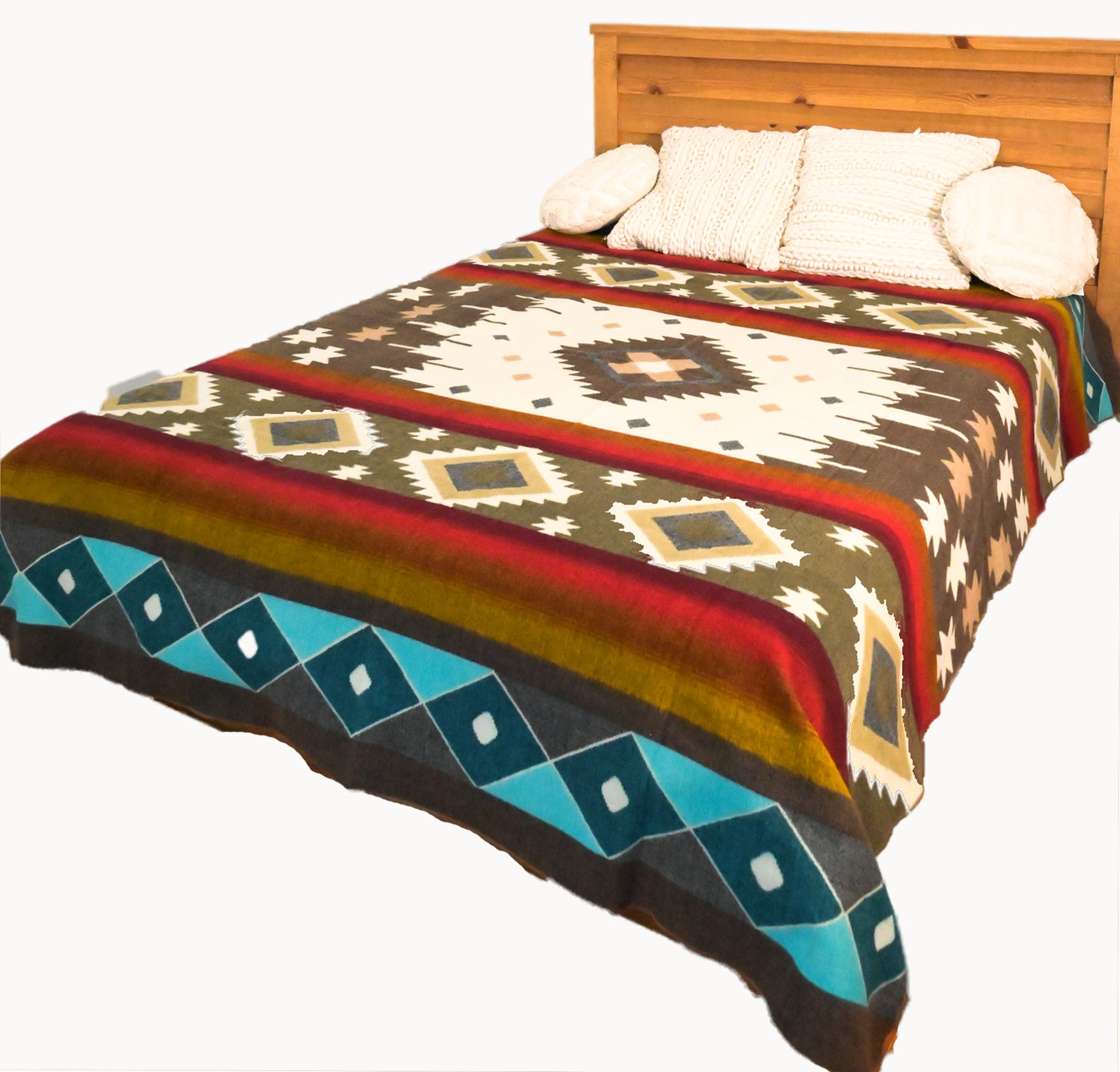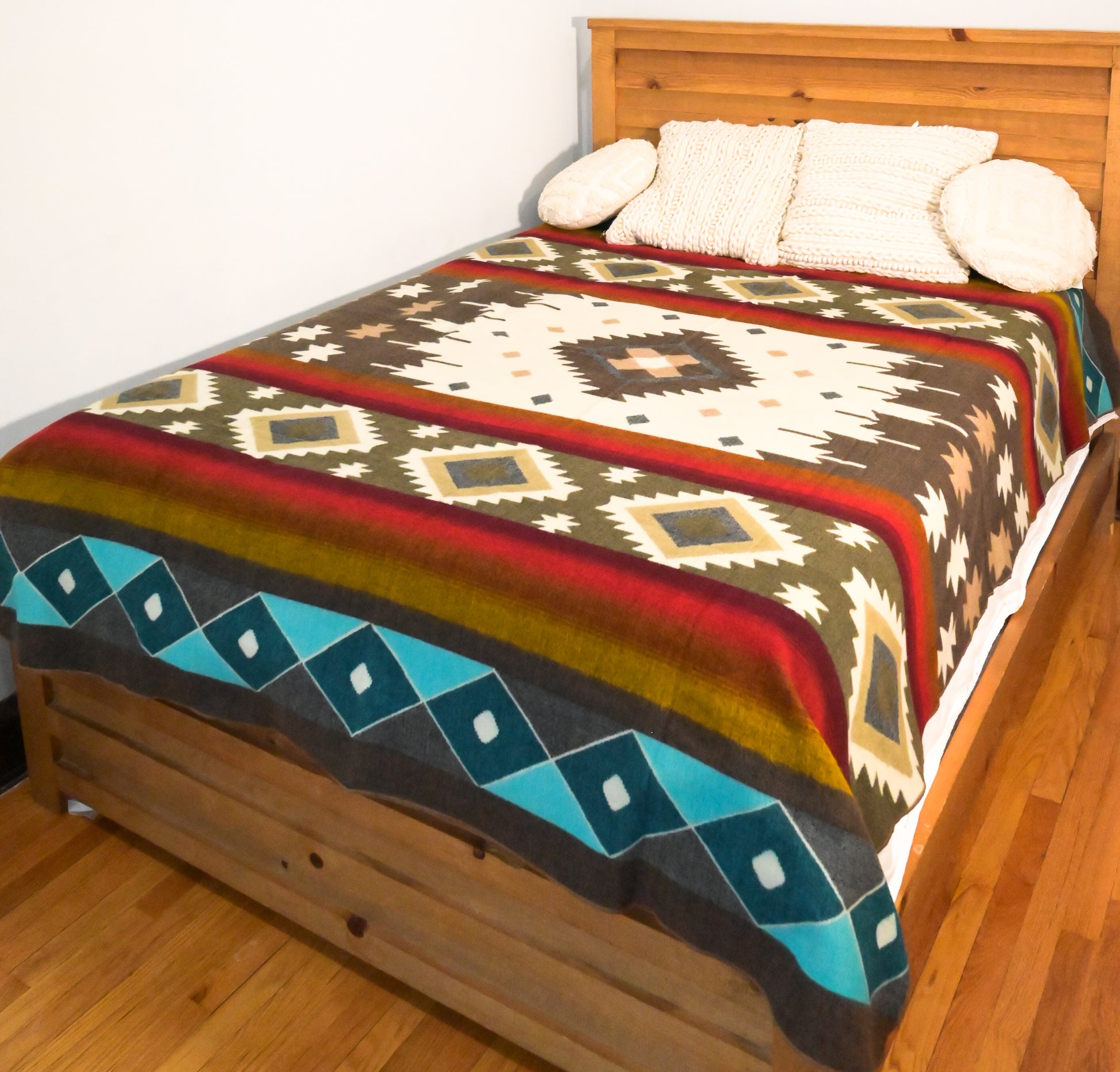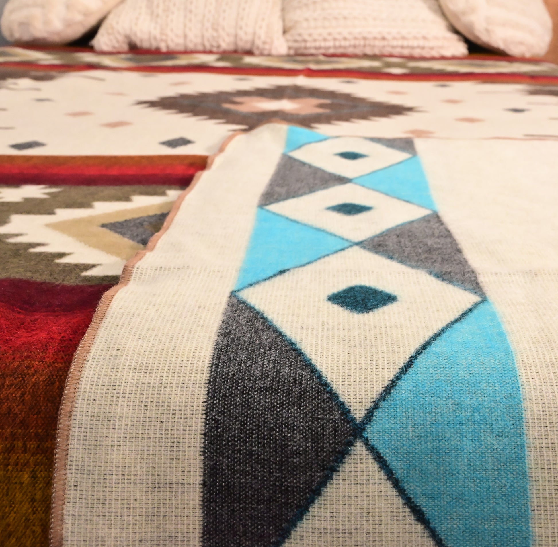 The Cuicocha blanket is created using symbolism of the lake of the gods, Known as Laguna Cuicocha located high up in the Andean Mountains range. It is believed that this lake formed from an ancient volcano is where spirits rest who have transitioned. The diamond pattern symbolizes the lake while the chacana patterns symbolizes the four directions as well as the various plains of existence. This blanket is produced, designed and sold by Kichwa Indigenous artisans and Kichwa families.